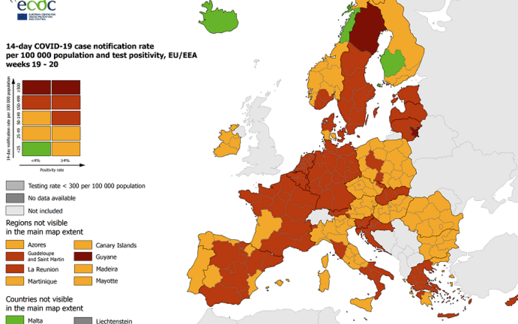 Στον συνδυαστικό χάρτη του ECDC με δεδομένα των δύο τελευταίων εβδομάδων (14-27 Μαΐου) που αφορούν στον δείκτη τεστ, τα νέα κρούσματα και τον δείκτη θετικότητας, το μεγαλύτερο μέρος της Ελλάδας είναι στο «πορτοκαλί», εκτός από νησιά στο βόρειο Αιγαίο, αλλά και το μεγαλύτερο μέρος της Πελοποννήσου, που βρίσκονται στο «κίτρινο».
