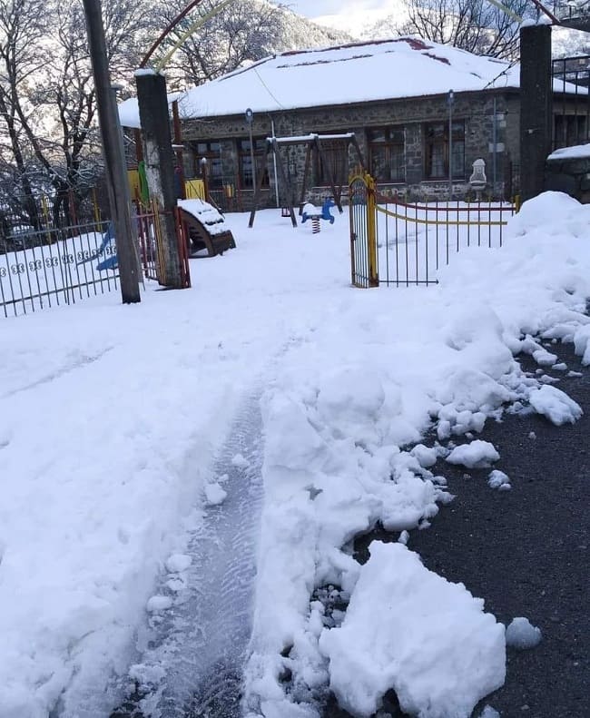 Αυτή είναι η εικόνα από τον περιβάλλοντα χώρο στο σχολείο του Διστράτου. Μετά την έντονη χιονόπτωση της Κυριακής μάλλον κανένας δεν μερίμνησε να καθαρίσει την αυλή και τον δρόμο για την πρόσβαση των λίγων μαθητών.