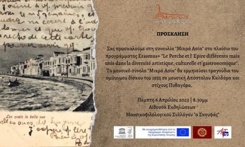 Το μουσικό σύνολο “Μικρά Ασία” του Μουσικού Σχολείου Άρτας μοιράζεται με το κοινό τα τραγούδια του ομώνυμου δίσκου την Πέμπτη 6 Απριλίου 2023 και ώρα 20.30 στην αίθουσα εκδηλώσεων του Μουσικοφιλολογικού Συλλόγου “Ο Σκουφάς”, στο πλαίσιο προγράμματος ERASMUS+ καθώς, σύμφωνα με όσα αναφέρει στις σημειώσεις του ο Λευτέρης Παπαδόπουλος: «… Η “Μικρά Ασία” πριν απ’ όλα, έχει ένα καταπληκτικό θέμα. Κι αυτό το θέμα, δεν αφορά μόνο τους Μικρασιάτες, τους Πόντιους, τους Κωνσταντινουπολίτες… Αφορά όλους τους Έλληνες. Και τα εκατομμύρια των παιδιών, που είχαν πρόσφυγες γονείς και τώρα έχουν γίνει κι αυτά πατεράδες και παππούδες, αλλά και τους Πελοποννήσιους και τους Αθηναίους και τους Θεσσαλούς και τους Μακεδόνες και τους νησιώτες και τους Ηπειρώτες και τους Θράκες-τους πάντες…»