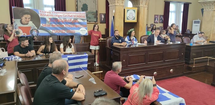 Στην ισόγεια αίθουσα του Δημαρχείου βρέθηκαν φίλοι και συναθλητές της Έλενας Παπασταματοπούλου με ελληνικές σημαίες και πανό καλωσορίσματος.