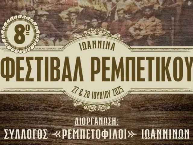 Ο Σύλλογος Ρεμπετόφιλων Ιωαννίνων διοργανώνει το 8ο Φεστιβάλ Ρεμπέτικου στην πόλη των Ιωαννίνων, στις 27 & 28 Ιουνίου 2025, στο 9ο Πειραματικό Διαπολιτισμικό Δημοτικό Σχολείο, σε έναν πανέμορφο χώρο μέσα στο Κάστρο Ιωαννίνων.