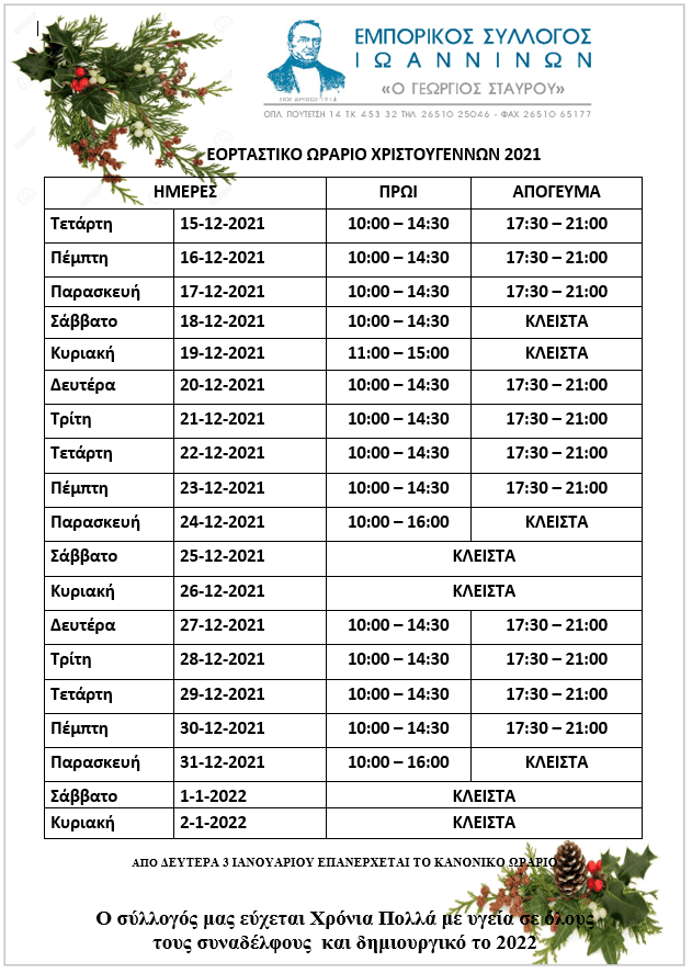 Το εορταστικό ωράριο των Χριστουγέννων ανακοίνωσε ο Εμπορικός Σύλλογος Ιωαννίνων.