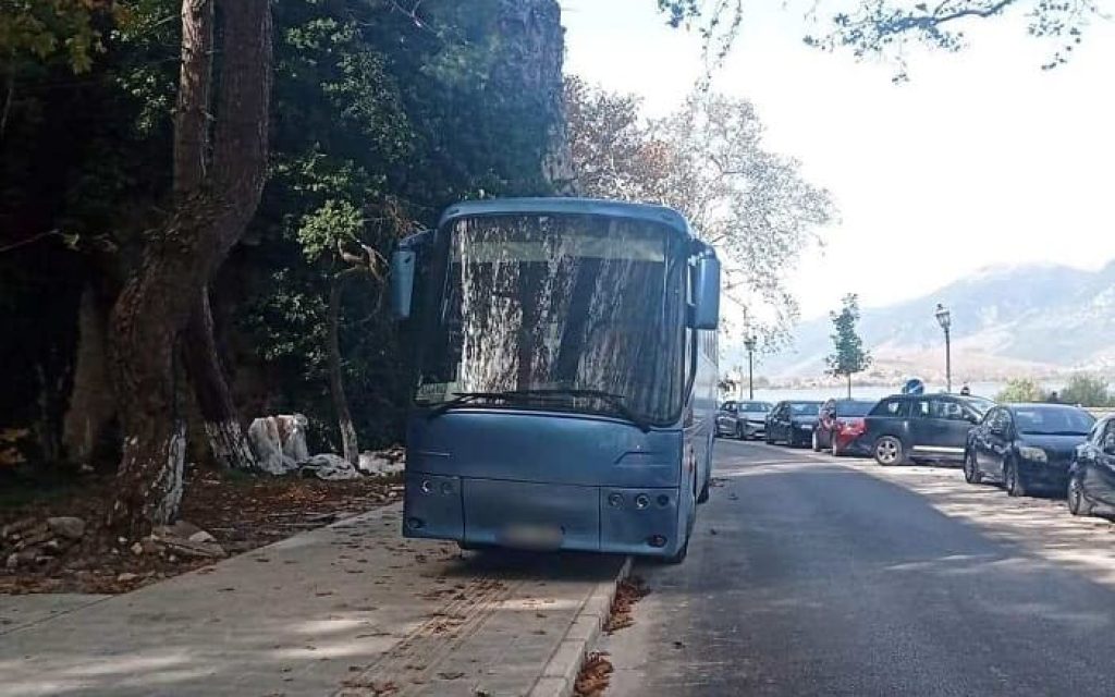 Ένα τουριστικό λεωφορείο παρκαρισμένο πάνω στο πεζοδρόμιο της παραλιμνίου που ανακατασκευάστηκε πρόσφατα.