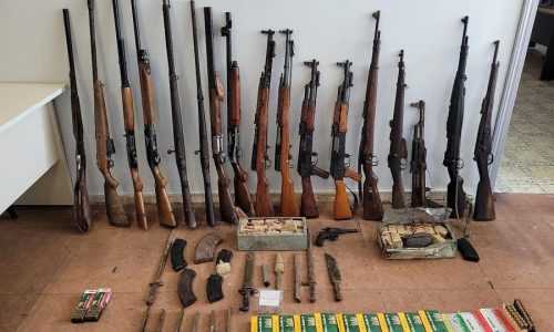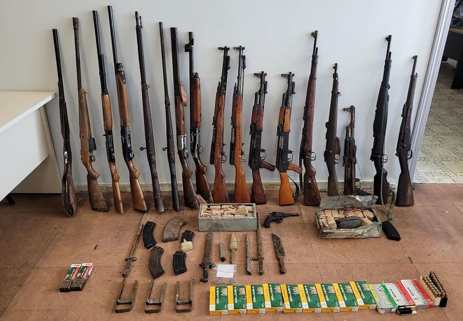 Το εντυπωσιακό είναι ότι από την έρευνα που έγινε σε σπίτι και σε καφενείο εντοπίστηκε ένα πραγματικό οπλοστάσιο καθώς βρέθηκαν Καλάσνικωφ, κυνηγετικά, πολεμικά όπλα διαφόρων τύπων, μαχαίρια και άλλα.